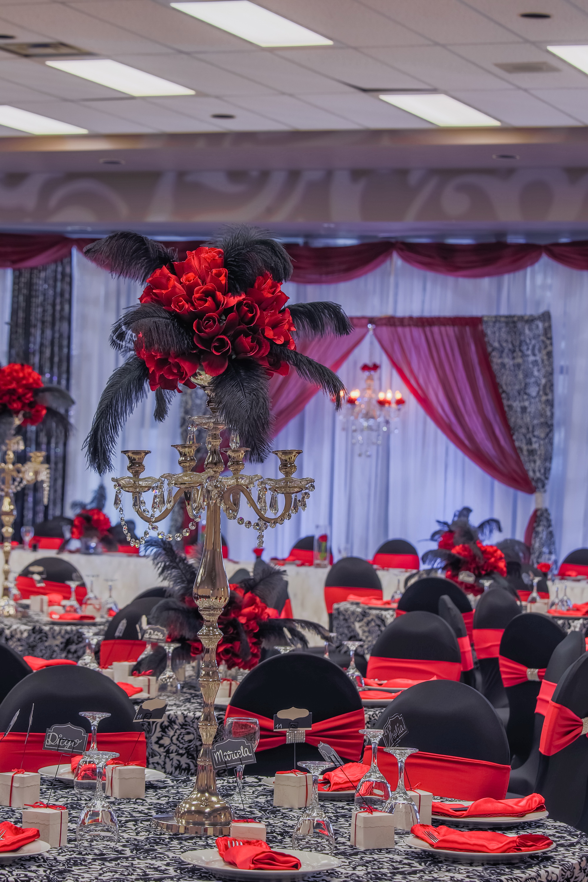 Silver crystal candelabra with red rose balls and black ostrich feathers
